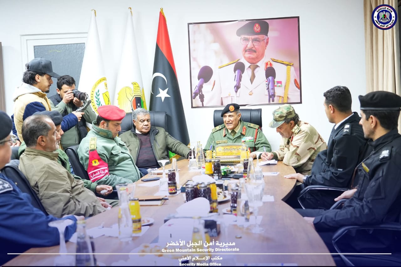 عُقد اجتماع أمني جمع آمر المنطقة العسكرية الجبل الأخضر ورئيس الغرفة الأمنية الجبل الأخضر اللواء عبدالعالي عيسى صالح مع مدير أمن الجبل الأخضر رئيس الغرفة الأمنية المشتركة بالمديرية اللواء وهبي أنور الرخ، بحضور مدراء الأجهزة والإدارات الأمنية والعسكرية بمنطقة الجبل الأخضر وناقش الاجتماع متابعة الأوضاع الأمنية بالمنطقة، وآليات تعزيز التنسيق والتعاون بين مختلف الأجهزة الأمنية والعسكرية بما يساهم في حفظ الأمن والاستقرار وتعزيز العمل الأمني المشترك كما تم التأكيد خلال الاجتماع على أهمية تكاثف الجهود وتوحيد العمل بين كافة الجهات الأمنية والعسكرية لضمان المحافظة على الأمن والاستقرار بمنطقة الجبل الأخضر، وتكثيف الجهود لمواجهة أي ظواهر سلبية من شأنها المساس بالأمن العام