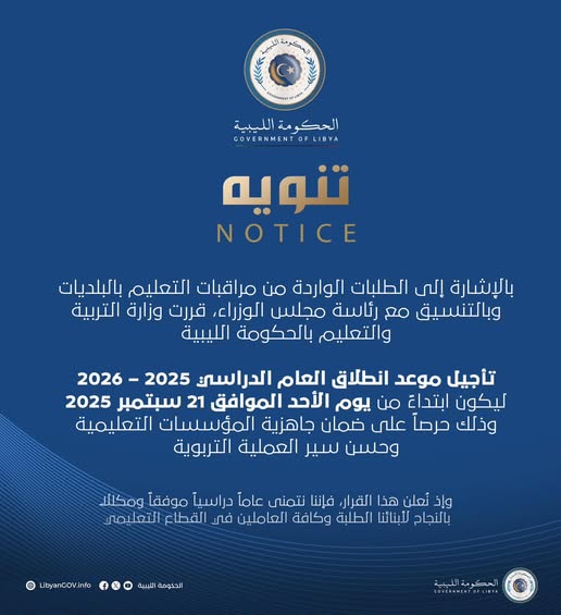 بناء على تعليمات رئيس مجلس الوزراء الدكتور اسامة حماد وزارة التربية و التعليم بالحكومة الليبية تؤجل انطلاق الدراسة إلى يوم الأحد الموافق 21 سبتمبر 2025